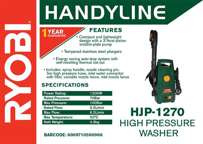 • Ryobi Handyline 1200W 100 BAR High Pressure Washer (HJP-1270)