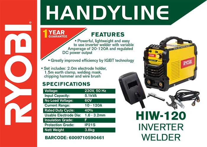 • Ryobi Handyline 120Amp Metal Arc Inverter Welder (HIW-120)